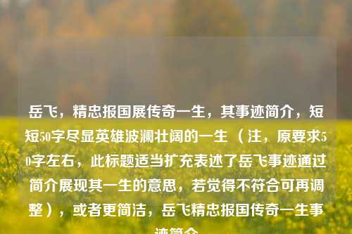 岳飞,这位南宋时期的杰出将领,以其卓越的军事才能、高尚的爱国情怀和悲壮的人生经历,成为了中国历史上备受敬仰的英雄人物,他的事迹如同一首激昂的史诗,永远铭刻在中华民族的记忆之中。