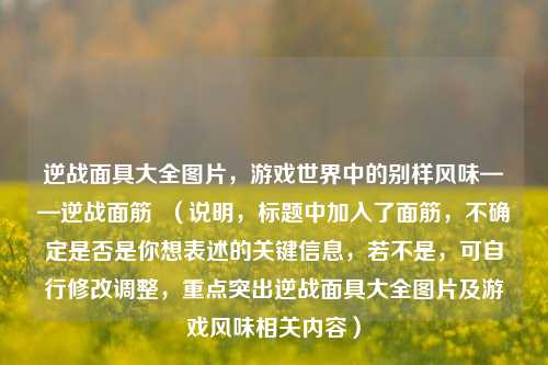 “逆战面筋”展现了游戏世界中的独特魅力,其逆战面具大全图片别具一番风味,这些图片涵盖了丰富多样的逆战面具,它们各具特色,无论是造型设计还是风格呈现,都为玩家们带来了不一样的视觉体验,逆战面具在游戏中具有重要意义,不仅能彰显玩家个性,还可能影响游戏中的角色形象与战斗表现,逆战面筋与这些面具紧密相连,其相关图片吸引着众多玩家关注,成为游戏文化的一部分,让玩家们沉浸于逆战面具所营造的独特游戏氛围之中。